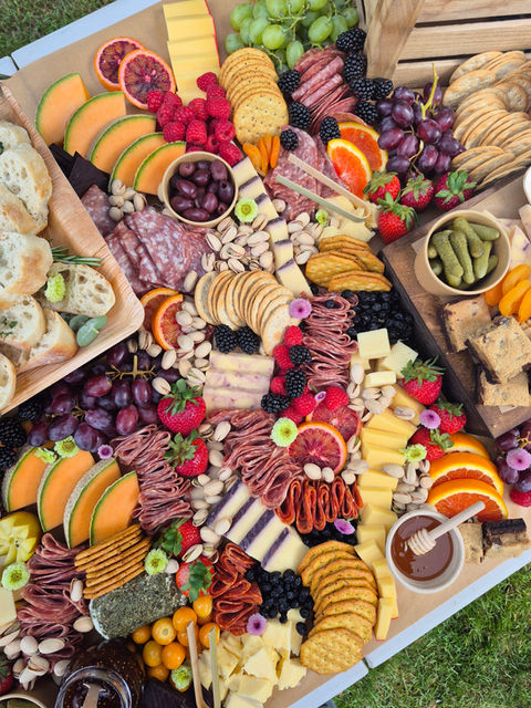 Every Graze Table includes all the top tier charcuterie essentials. Cured and dried meats, artisan cheeses, crackers and bread, fresh and dried fruits, fresh and pickled veggies, honey, and jams. The table is garnished with herbs, greenery and seasonal flowers. Truly, edible art.